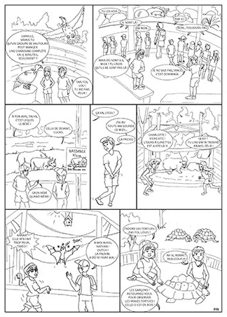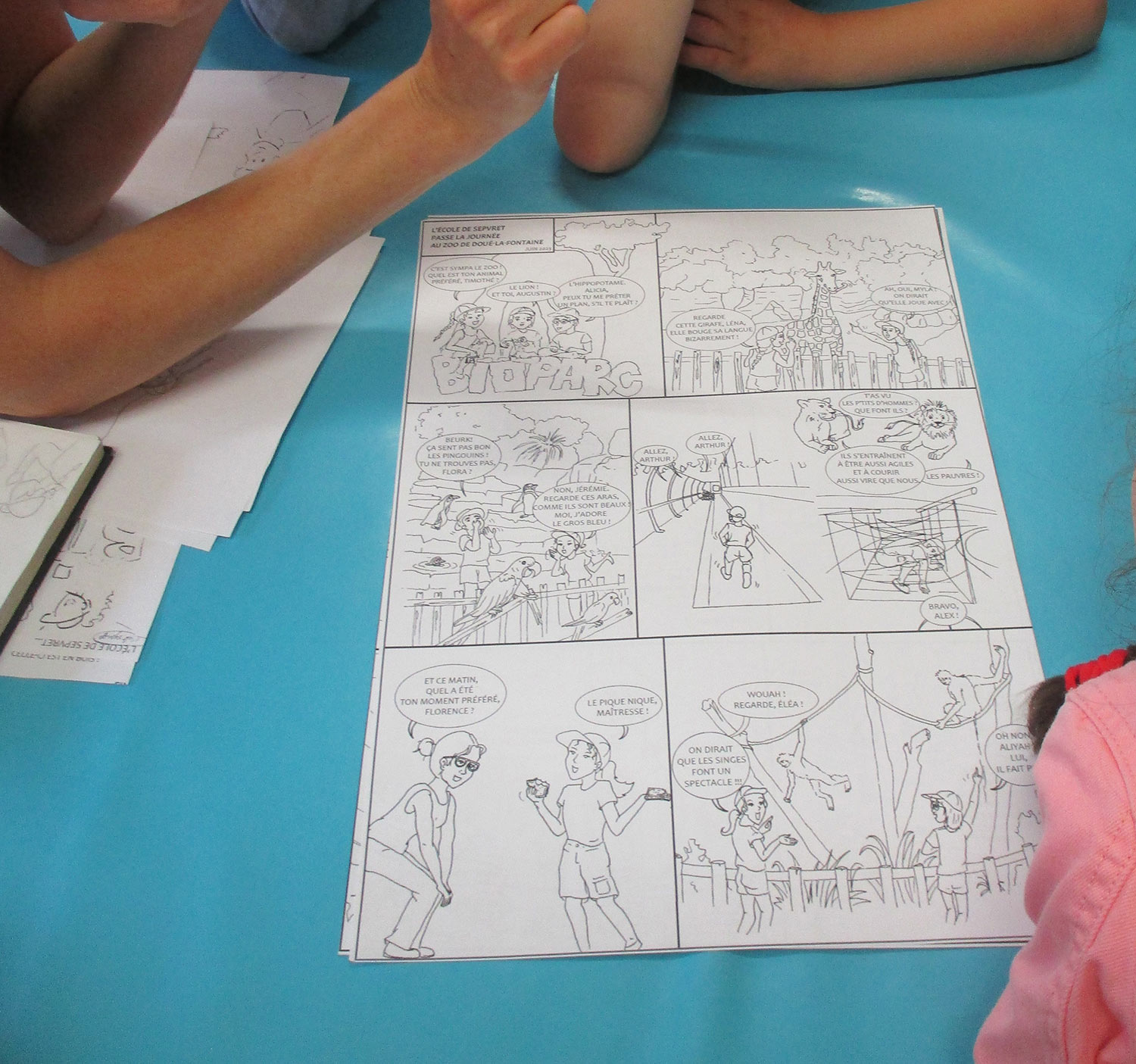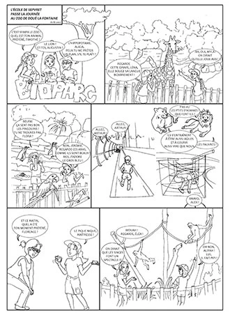Puis, découverte du dessin au travers du croquis et colorisation par les élèves. (ici, racontant la sortie au zoo d’une classe de CP)